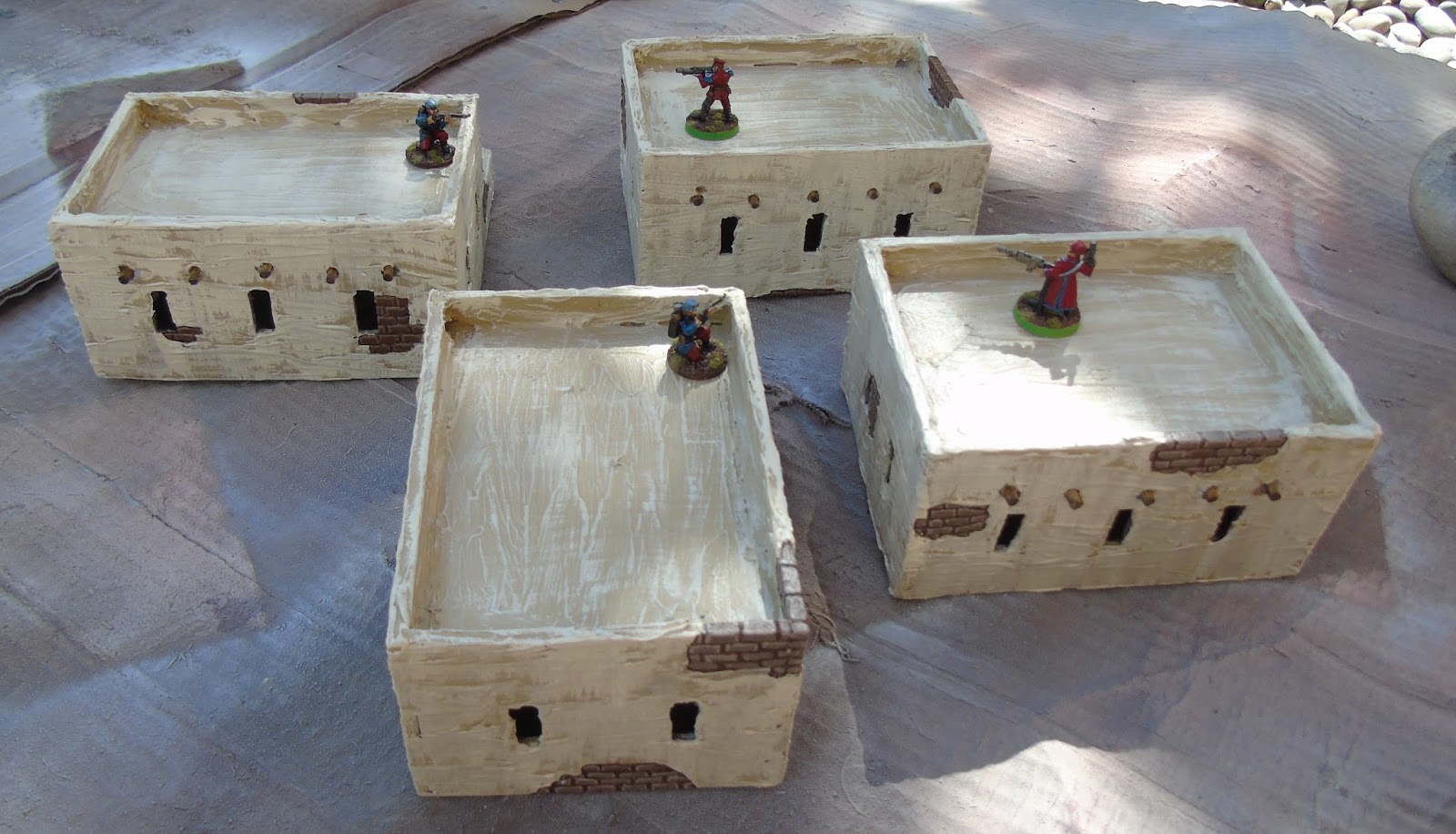 Everyone was posing behind this new building I made. The Indian terrain in a recent Wargames Illustrated inspired me to make cheap knockoffs of the buildings in it. It's just hot glued foam core board with the paper removed. After assembly, I simply covered it in spackle and primed it.